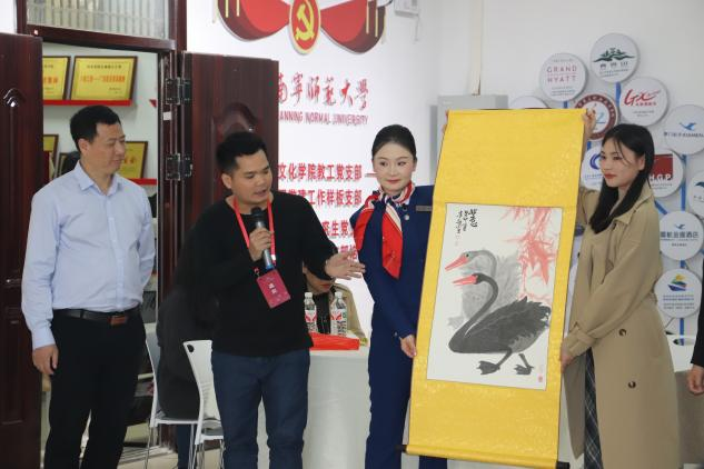 这次回母校,我带了份小礼物。我平时特别爱收藏美术书画作品,旅文不分家,每次带团我都跟贵宾们分享广西的国画山水与民族风情美术作品,游客们都特别爱听这类讲解,这也让我的讲解独树一帜,让客人感觉到不同于其他行程的讲解。这次赠送了一幅来自广西青年美术家韦贵敏(中国美协会员,南宁美协理事,北部湾书画院研究员)的没骨留痕法创作的水墨大鹅,作品不画线,用水墨浓淡来写出鹅毛的层次感。作品上有我的收藏闲章“养正”,“养正书院”来自宾阳南街,主要理念是“养正一个孩子,可以兴旺一个家族;养正千千万万个孩子,可以兴旺一个民族。”。该闲章表达了我当下的主导思想,希望这种理念能传达给更多身边的人。感谢段文军经理等现任旅文公司的领导们给了我一次表达感恩的机会。饮水思源,这份感恩的心,希望能传递给每一位旅文院走出的学子们!