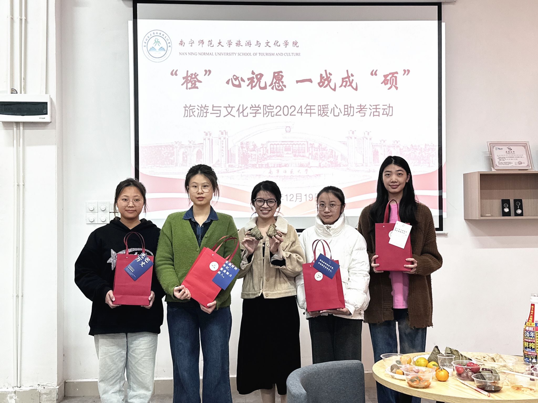 此外精心准备的礼物发放环节更是将活动推向了高潮。公司为考研学子们准备了精心定制的“考研加油包”。在定制的礼物袋中,每一样物品都饱含深意。旺仔寓意着“旺”运当头,希望学子们在考试中能够超常发挥,收获理想的成绩;橙子谐音“成”,代表着“一战成‘硕’”的美好祝愿;暖宝宝在寒冬之际为学子们送去身体上的温暖,也象征着公司始终是他们坚实的后盾,给予心灵的慰藉;可爱的杯子则寓意着一辈子的友情与公司对他们永恒的支持,无论结果如何,他们都永远是公司大家庭中备受珍视的一员;励志卡片上写满了对学子们的鼓励与期许,那些真挚的话语如同一束束光,照亮他们前行的道路。每一份礼物都经过精心挑选和包装,承载着公司师生对考研学子深深的牵挂与祝愿。收到礼物的同学们感动不已,纷纷表示这些礼物不仅实用,更让他们在紧张的备考中感受到了来自公司大家庭的温暖与支持,增强了他们面对考试的信心和勇气。